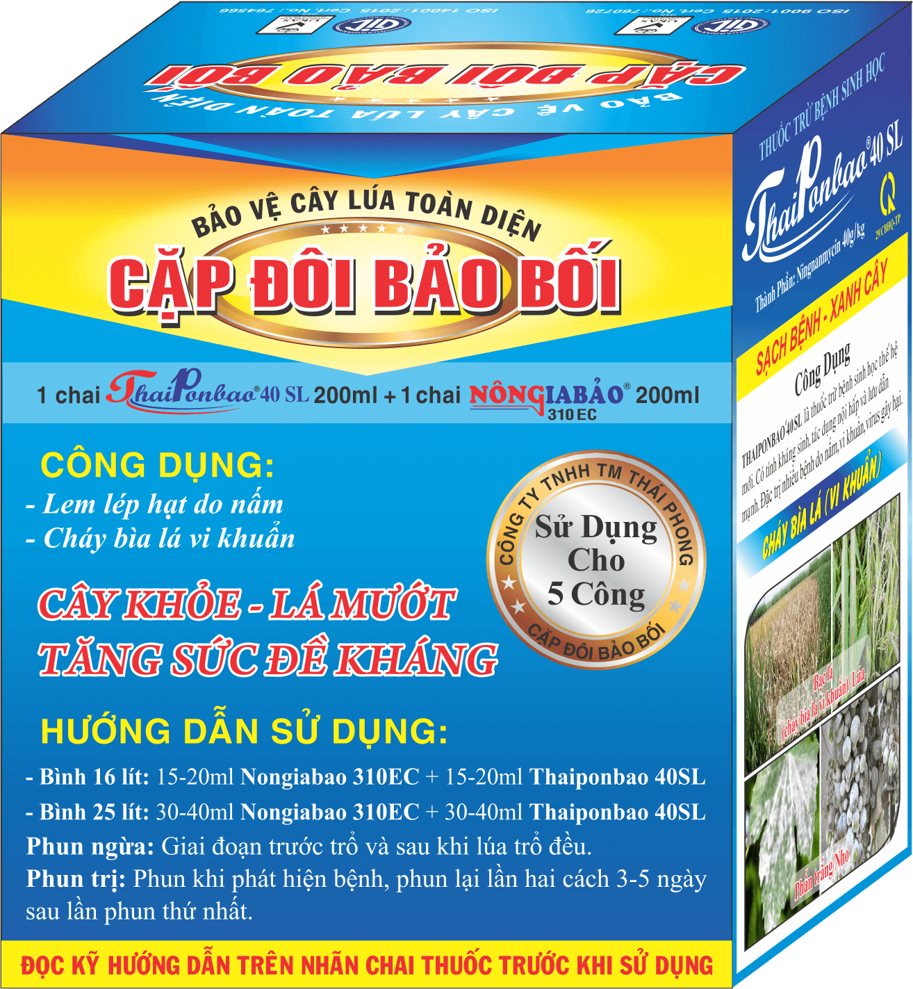 Cặp đôi bảo bối là sự kết hợp giữa 2 sản phẩm Nongiabao 310 EC (Difenoconazole 150g/l+Propiconazole 160g/l) và Thaiponbao 40SL (Ningnanmycin 40g/kg) có tác dụng nội hấp, thấm sâu và lưu dẫn mạnh phòng trị nhiều loại bệnh do nấm, vi khuẩn và virus gây ra